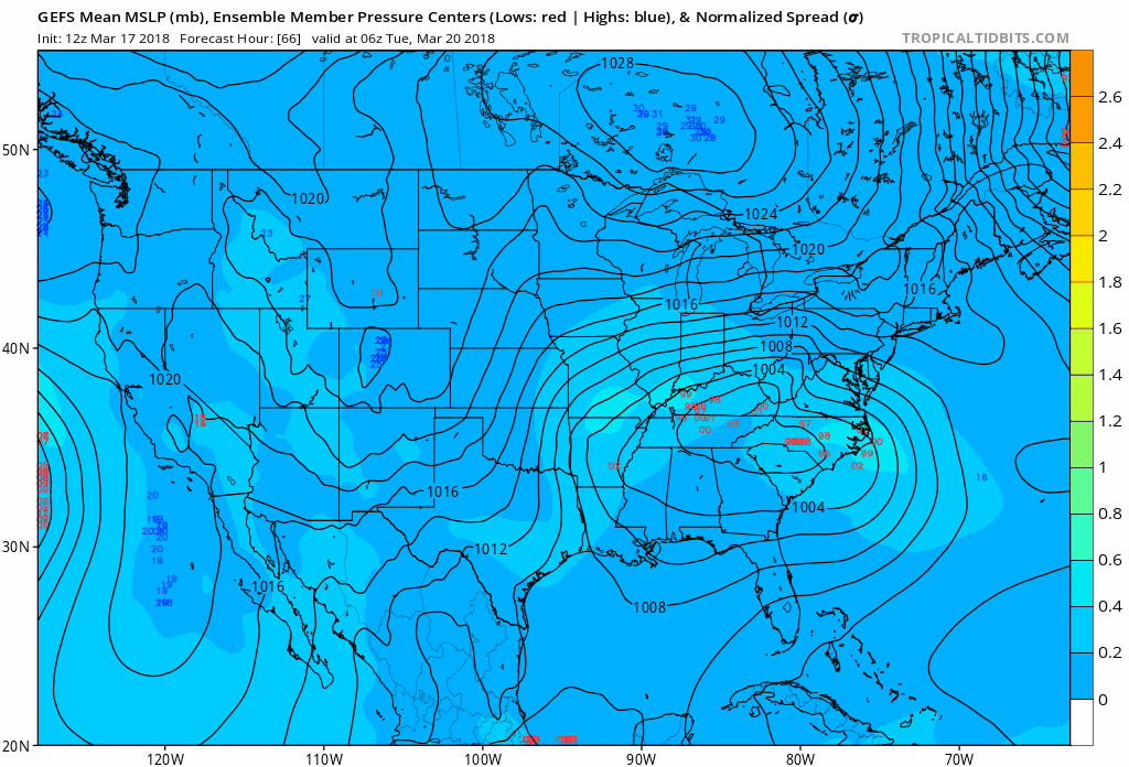 3/15 Strong signals that something will happen next week, just exactly what is tbd. All models have something moving through, but is it over us, south of us and out to sea? Here's the NAVGEM from 12z today. Typically the NAVGEM is east or southeast of where the storm ends up. We use it as a guide to compare with other more dynamic models, so when the other models are south or east of the NAVGEM there is confusion. NAVGEM rarely gives a storm 3 days of life.